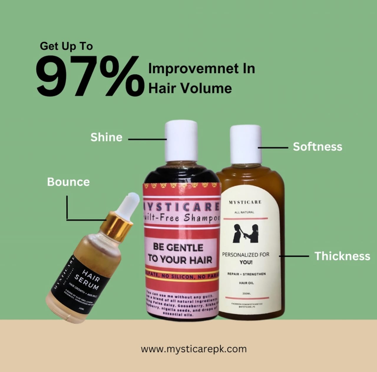 Experience the transformation with Mysticare’s natural 3-step care. Our shampoo deeply moisturizes and softens hair, while the serum reduces frizz and restores manageability. The result? Hair that looks healthier, feels silkier, and shines naturally after just a few uses.